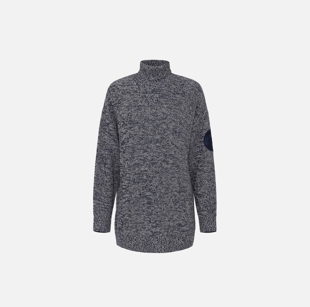 Dolcevita in viscosa mouliné punto pannocchia con spalle scese. È caratterizzato da patch logo ricamato sulla manica.