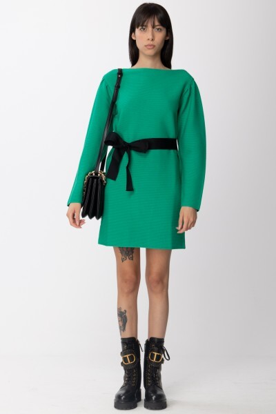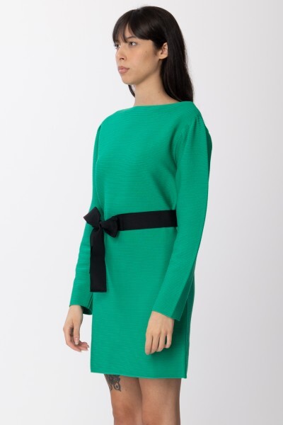 Abito corto in viscosa stretch compatta a coste orizzontali con cintura in gros-grain, linea dritta.