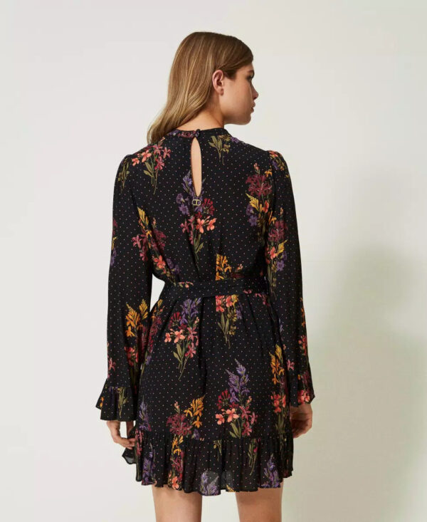 Abito corto in crêpe di viscosa con stampa bouquet e pois, collo tondo, maniche lunghe con volant, cintura in coordinato.