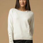 Elegante e ricca di dettagli, questa maglia presenta i polsini alti a costine, impreziositi da bottoni gioiello e maniche lunghe raglan. Il capo presenta scollo rotondo e vestibilità regolare