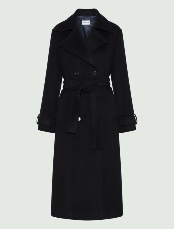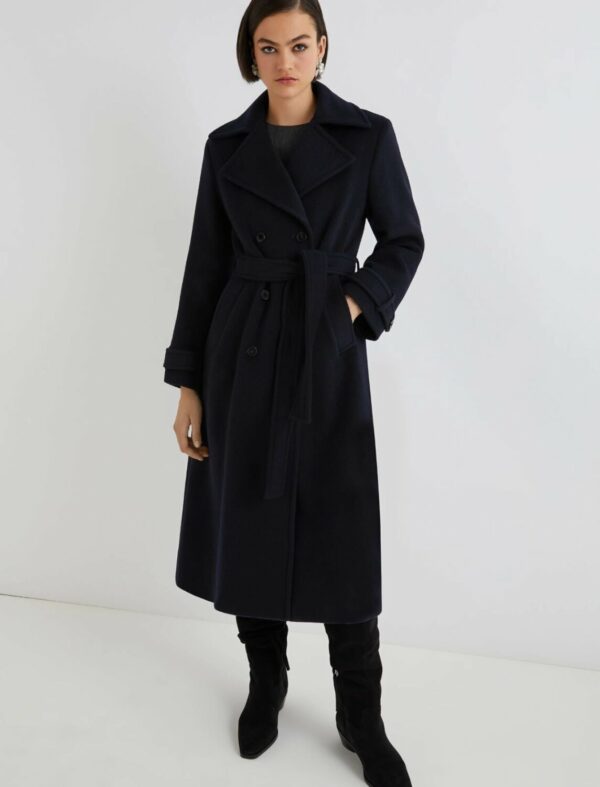Chiusura doppiopetto con bottoni a vista e cintura