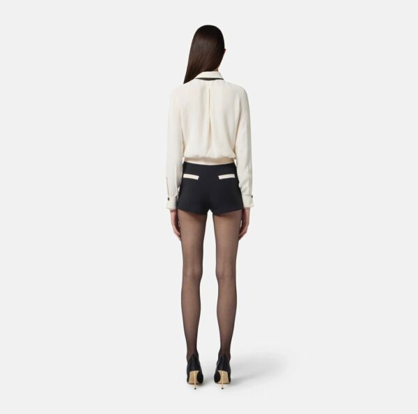 Camicia in georgette dalla vestibilità slim. Il colletto è arricchito dal foulard con stampa geometrica, trattenuto dal passante gioiello con logo. I polsi hanno bottoncino a contrasto e doppio strato in organza che crea raffinate trasparenze.