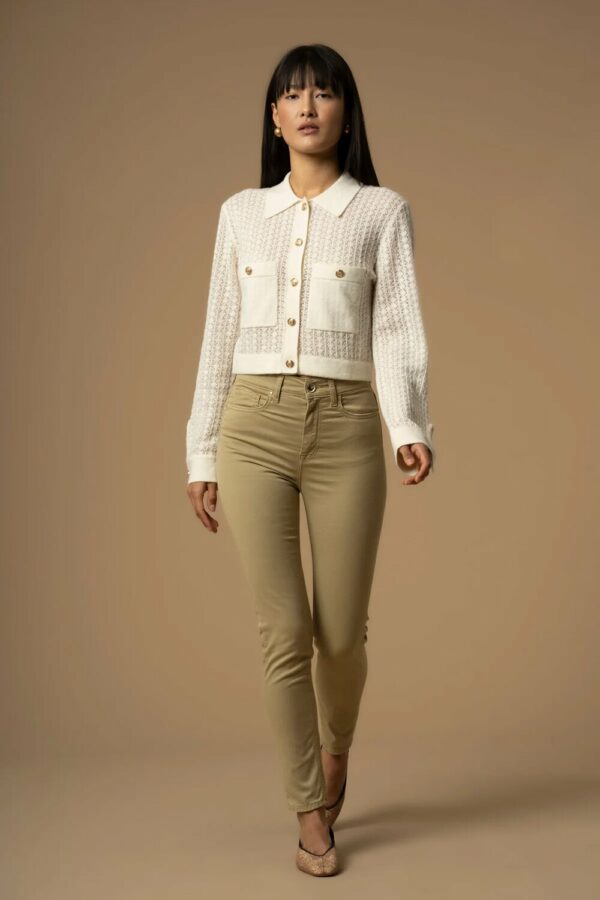 Questa maglia è caratterizzata da un taglio crop impreziosito dal tessuto all over traforato e dai profili in contrasto. Il capo presenta colletto a punta, tasche sul davanti, polsini e chiusura frontale con bottoni dorati.