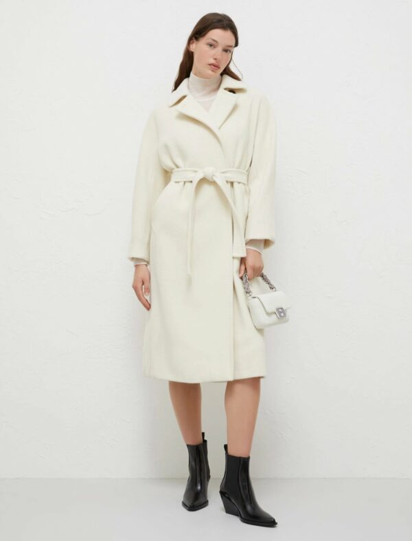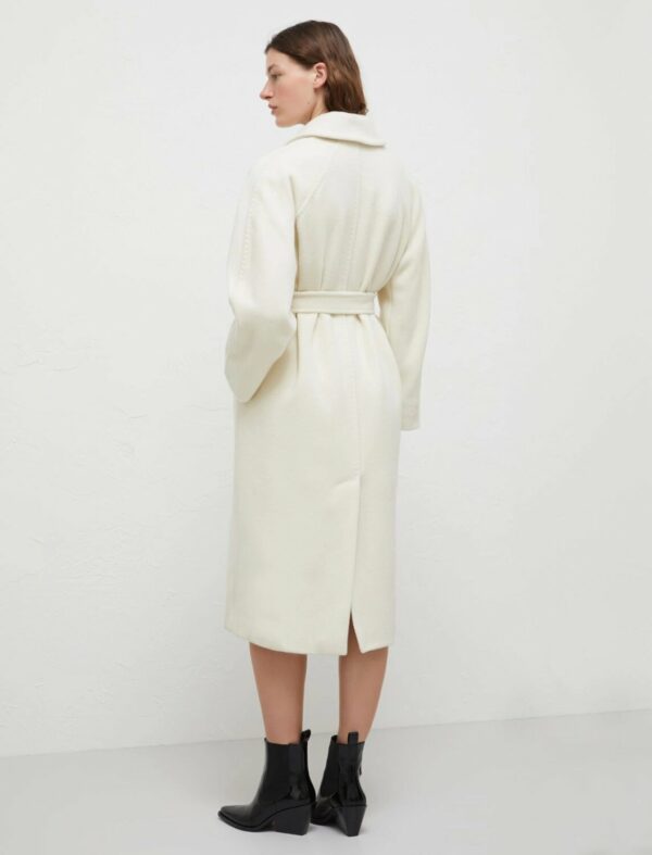 Chic in the city: il cappotto in pura lana è ideale da mattina a sera. Il collo a camicia e le maniche a kimono aggiungono un flair metropolitano al classico taglio sartoriale.