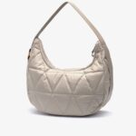 Didiane è una borsa hobo a spalla ideale per il quotidiano, il viaggio e il tempo libero. Realizzata in tessuto trapuntato idrorepellente con imbottitura leggera, presenta una tracolla confortevole, un interno capiente con tasche e una base resistente in materiale sintetico effetto pelle tono su tono.