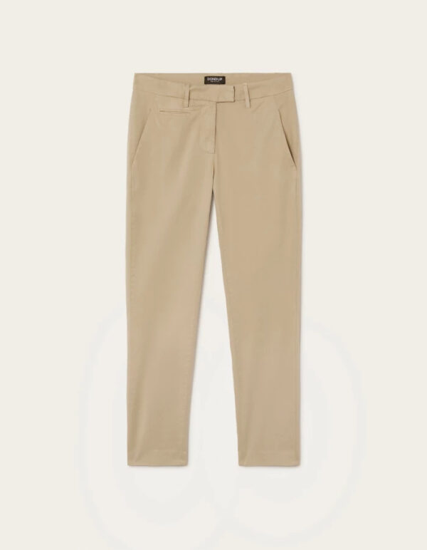 Pantaloni Perfect cropped slim chino, vita regolare, tasche a filetto posteriori. Gabardina leggera. Tintura in capo. Logo Dondup. Made in Italy