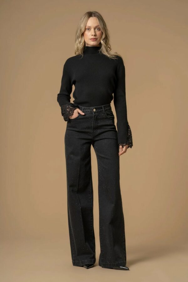 Una serie di delicati e scintillanti strass impreziosiscono il tessuto di questi pantaloni in denim, caratterizzati dalla gamba dritta e larga, passanti in vita e chiusura con zip e bottone logato.
