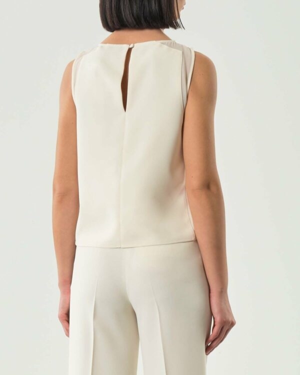 Top smanicato dalla linea femminile, arricchito dalla sensualità della georgette applicata su scollo e giro manica. Un mix materico sofisticato, da indossare con pants fluidi o con i denim preferiti.