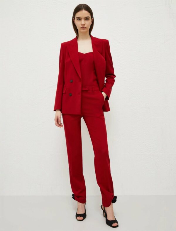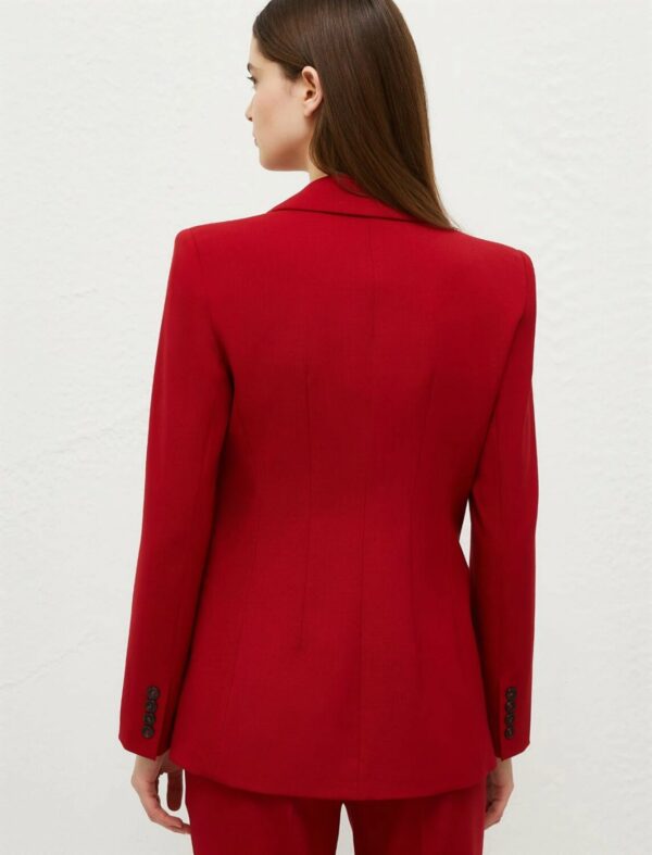 L'energia del blazer formale incontra il flair vibrante del rosso carminio, per un capo da indossare nelle giornate più impegnative. Ideale con i jeans o con la gonna coordinata per un business suit impeccabile.