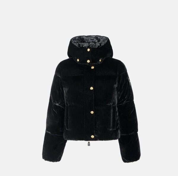 Piumino cropped in velluto dalla vestibilità regular. Presenta collo a cratere con cappuccio amovibile, tasche a filetto, chiusura con patta abbottonata e zip. L'interno in tessuto vela garantisce protezione e comfort. La patch con logo su una manica completa il capo.