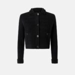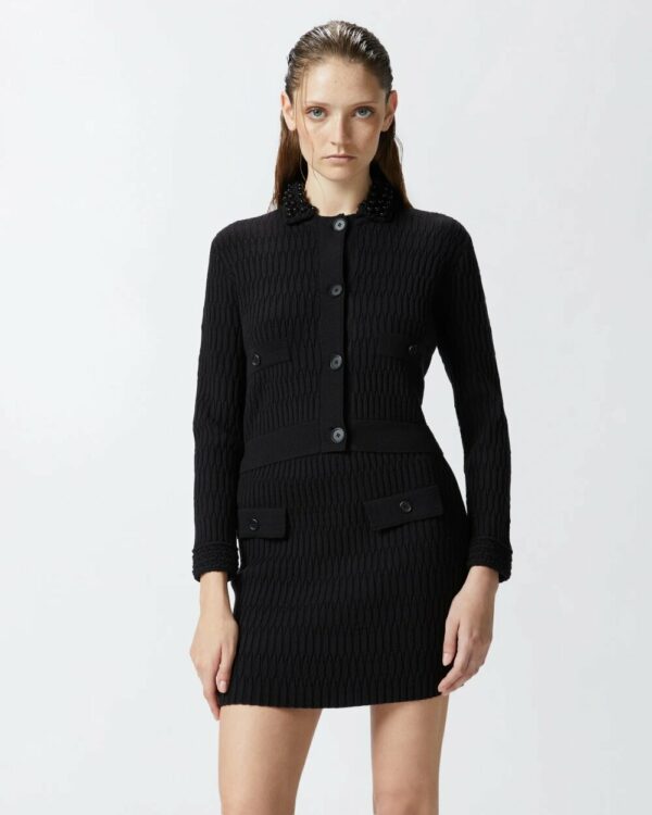 Piccola giacca dal taglio corto in maglia di misto lana lavorata con un particolare tipo di punto che crea una texture geometrica d'effetto. Il capo è completo di colletto a camicia realizzato in maglia di cotone all'uncinetto impreziosito con perle in tono colore applicate, rimovile con piccoli bottoni sia per poter indossare la giacca senza colletto, se desiderato, sia per un lavaggio più facile e sicuro. Il volume aderente della giacca è completato da maniche lunghe, logo PINKO nel centro dietro intarsiato a contrasto di colore e chiusura monopetto con bottoni.