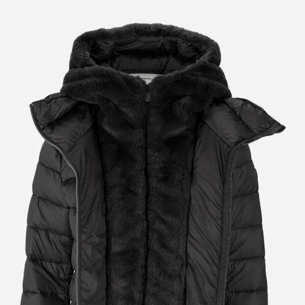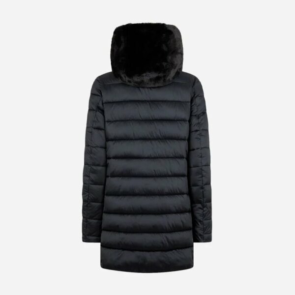 Giubbino trapuntato lungo con cappuccio in ecopelliccia, davantino staccabile in ecopelliccia. Chiusura con full zip, tasche basse con chiusura a zip invisibile. Logo applicato sulla manica sinistra.