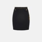 Gonna in doppio crêpe dalla vestibilità aderente. Si distingue per i dettagli preziosi come la cintura in catena con nappina realizzata in metallo dorato. Le patte sono decorate da bottoni smaltati con logo e pattern di ispirazione snake.