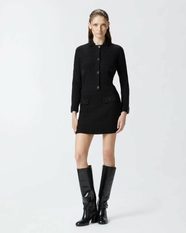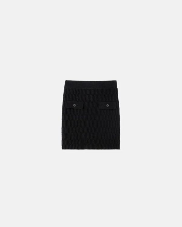 Minigonna aderente realizzata in maglia di misto lana lavorata con una particolare tipologia di punto che crea un pattern geometrico su tutto il capo. La gonna, completata da logo intarsiato a contrasto sul retro e doppia pattina applicata con bottone davanti, a simulare due tasche, è perfetta indossata in total look con la giacca abbinata, ma crea anche outfit da giorno particolarmente femminili e originali.