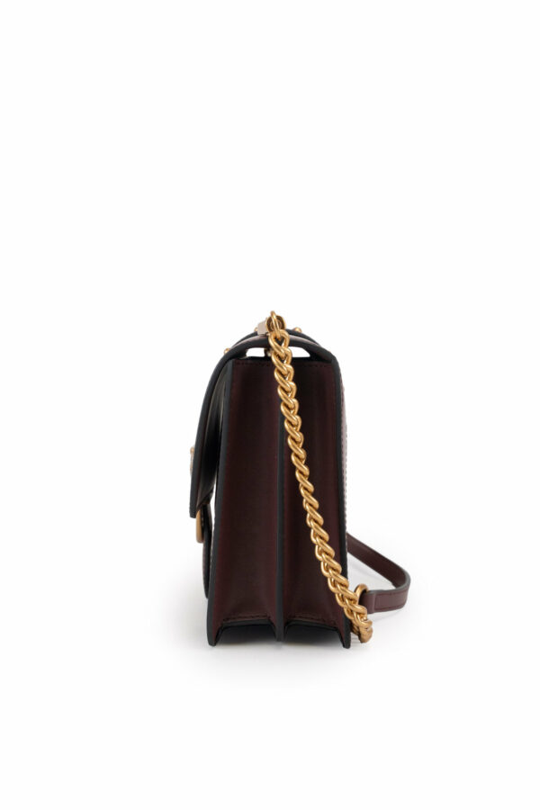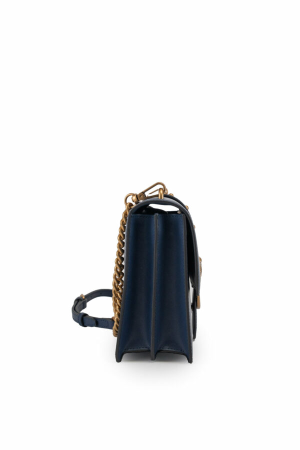 Classic Love Bag Icon in morbida pelle mano seta. La chiusura con baccello in pelle e borchie è completata dall'iconica fibbia in metallo Love Birds Diamond Cut in metallo. L'interno è foderato in microfibra scamosciata e comprende tramezza chiusa con zip e tasca a parete. La tracolla rimovibile combina la classica catena rotonda al pratico spallaccio in pelle regolabile.