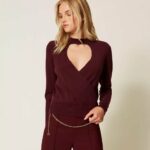 Maglia in viscosa stretch con incrocio davanti che crea un motivo cut-out. Ha collo in stile lupetto, maniche lunghe, profili rifiniti a costine, placchetta logo Oval T sul retro, linea morbida.