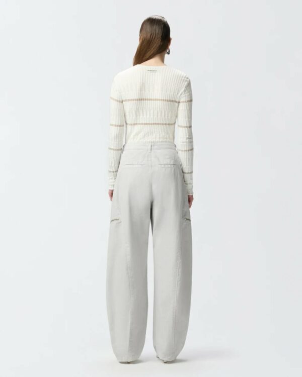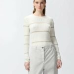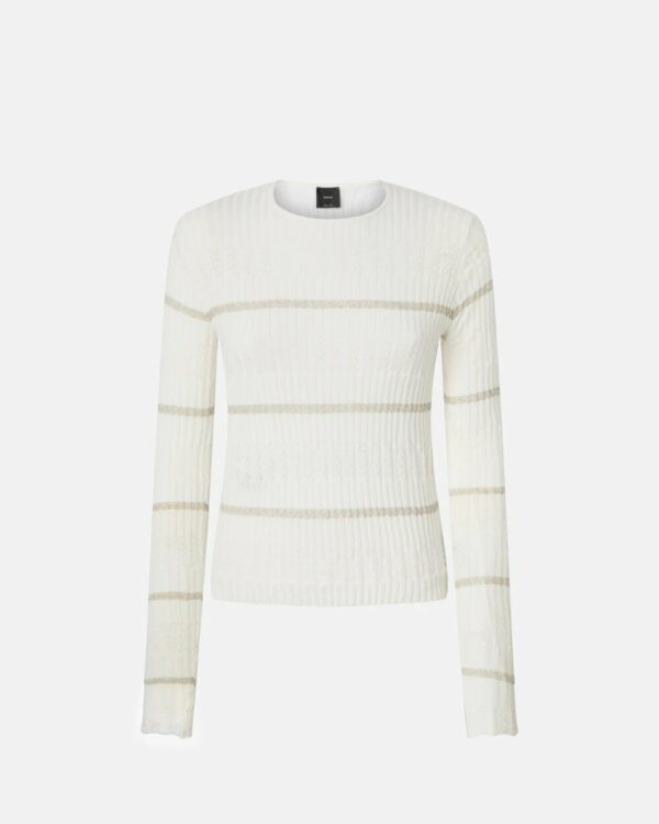 Maglia a maniche lunghe in prezioso filato di misto cotone e seta lavorato a costine con motivo punzonato, che aggiunge un dettaglio femminile, e fantasia a righe orizzontali con filo metallizzato, per un tocco scintillante e originale. La maglia dalla linea aderente è completata da classico scollo tondo ed etichetta logata sul retro del collo. Questa maglia è un capo passepartout da avere nel guardaroba primaverile, perfetta sia come top che come sottogiacca, in abbinamento a un tailleur più formale.