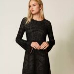 Abito corto di viscosa con lavorazione double bicolore e punzonature nella parte esterna del capo che in trasparenza evidenziano il disegno. Ha collo tondo, maniche lunghe, apertura a goccia con bottone sul retro, linea fitted con gonna morbida.
