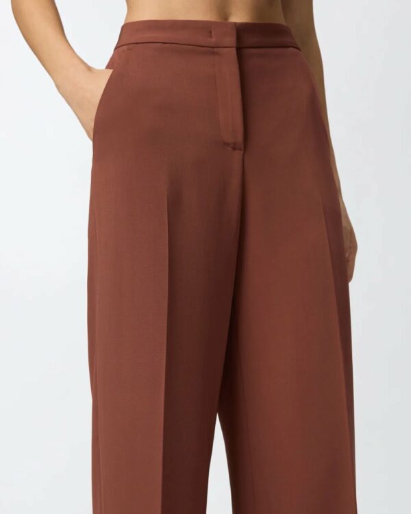 Pantaloni palazzo eleganti da donna, realizzati in cady tecnico, un tessuto particolarmente versatile e dall'aspetto raffinato. I pantaloni sono dotati di tasche alla francese sui fianchi e tasche a filetto sul retro, mentre la chiusura con zip è completata da gancio a uomo in vita. La gamba dalla linea ampia è personalizzata con piega centrale, sia davanti che sul retro. Indossati insieme al blazer abbinato, i pantaloni creano un total look da cerimonia impeccabile e trasversale.