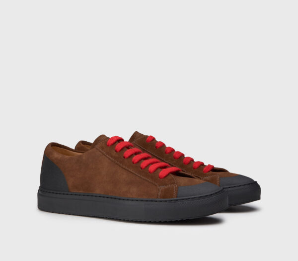 Sneakers in suede nelle tonalità del marrone, con lacci ed inserti gommati di colore a contrasto in punta e sul tallone. Suola in gomma ultra leggera dal profilo a cassetta. Made in Italy.