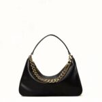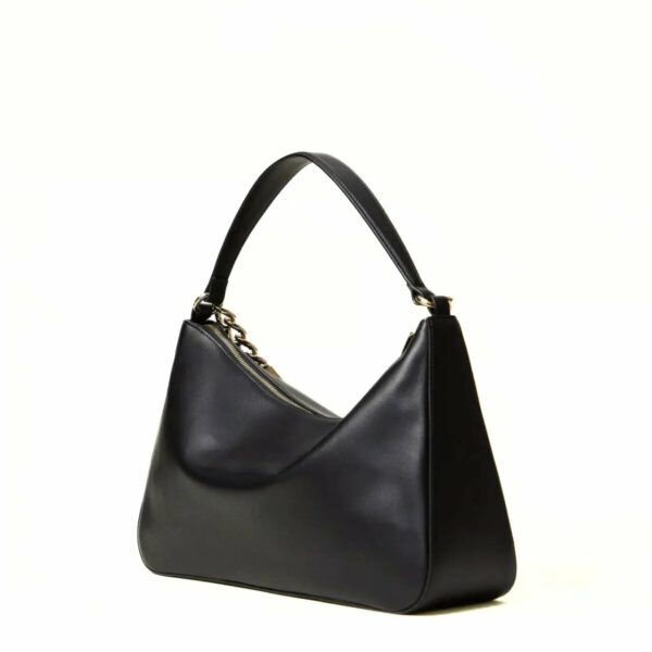 Borsa hobo 'Liliane' di TWINSET made in Italy, realizzata in pelle di vitello liscio pieno fiore con trattamento anti goccia e antigraffio. Il corpo è realizzato a colonna, con logo impresso a caldo, e foderato con un twill in misto cotone. Ha due manici staccabili, da indossare simultaneamente o separati per diverse interpretazioni di styling: uno in pelle sagomato e imbottito, l'altro è una catena in lega leggera in galvanica oro con l'Oval T inserito tra le maglie.