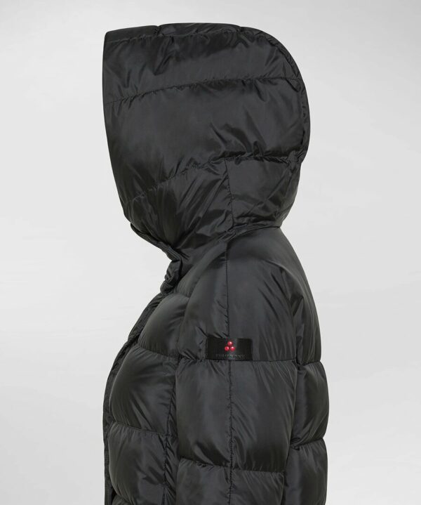 Piumino corto in tessuto superleggero, realizzato in 100% poliestere riciclato post consumo dalla mano morbida, struttura ultra compatta e finitura semi-opaca. Limbottitura in piuma naturale certificata garantisce calore e leggerezza, mentre il trattamento idrorepellente PFC Free protegge dalle condizioni atmosferiche più variabili, nel rispetto dellambiente. La varietà dei dettagli fa di questo capo un must-have del guardaroba femminile di questa stagione: full zip centrale e bottoni a pressione nascosti da patta, tasche laterali a scomparsa con bottone singolo a pressione, ampio collo a scialle che avvolge dolcemente proteggendo dalle intemperie e cappuccio fisso. Un capo riconoscibile per il perfetto mix tra estetica, praticità e stile urban, adatto a chi vive con dinamicità, spaziando tra occasioni mondane e momenti informali.